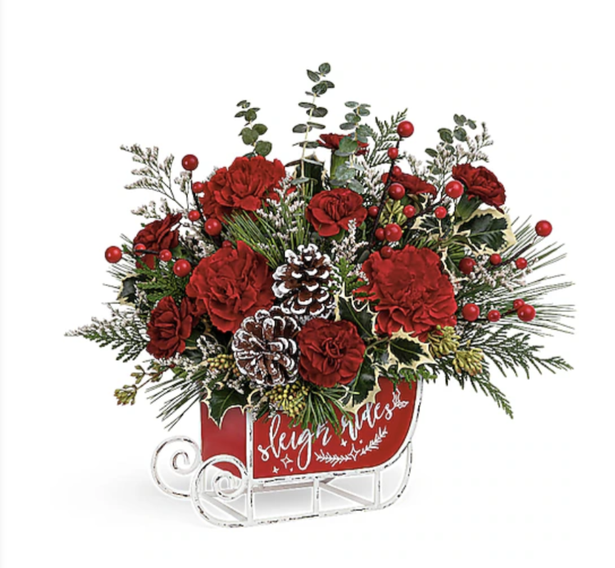 This festive arrangement features lush red carnations paired with fresh evergreens, holly leaves, and bright red berries for a classic Christmas look. Accented with frosted pinecones and arranged in a charming red metal sleigh with white scrollwork and “Sleigh Rides” script, it’s the perfect centerpiece for holiday gatherings or a thoughtful gift to spread cheer.